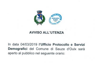 Si avvisa l'utenza che lo sportello dell'ufficio PROTOCOLLO, ANAGRAFE e STATO CIVILE del Comune di Sauze d'Oulx GIOVEDI' 17 OTTOBRE 2019 resterà...