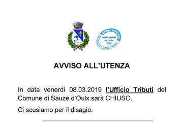 Per corso di formazione del personale, si avvisa che lo sportello all’utenza dell’Ufficio Tributi del Comune di Sauze d’Oulx