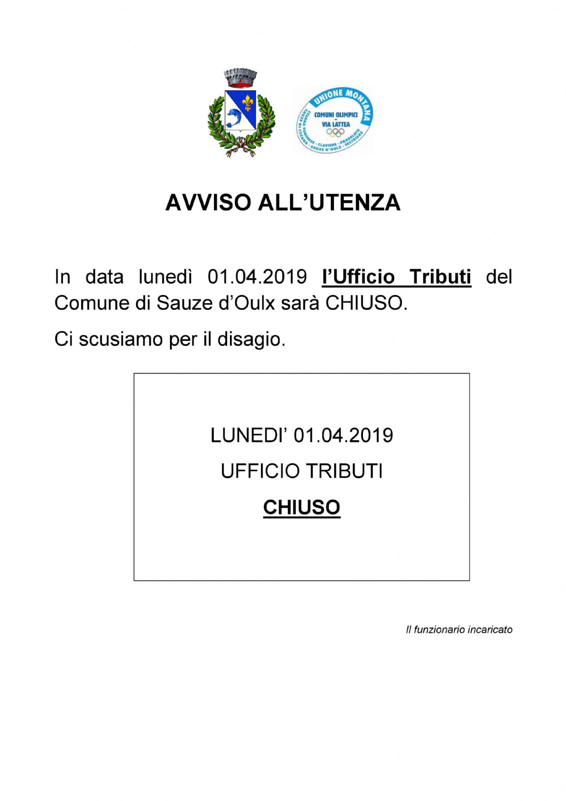 Si avvisa l'utenza che LUNEDI' 01.04.2019 l'Ufficio Tributi