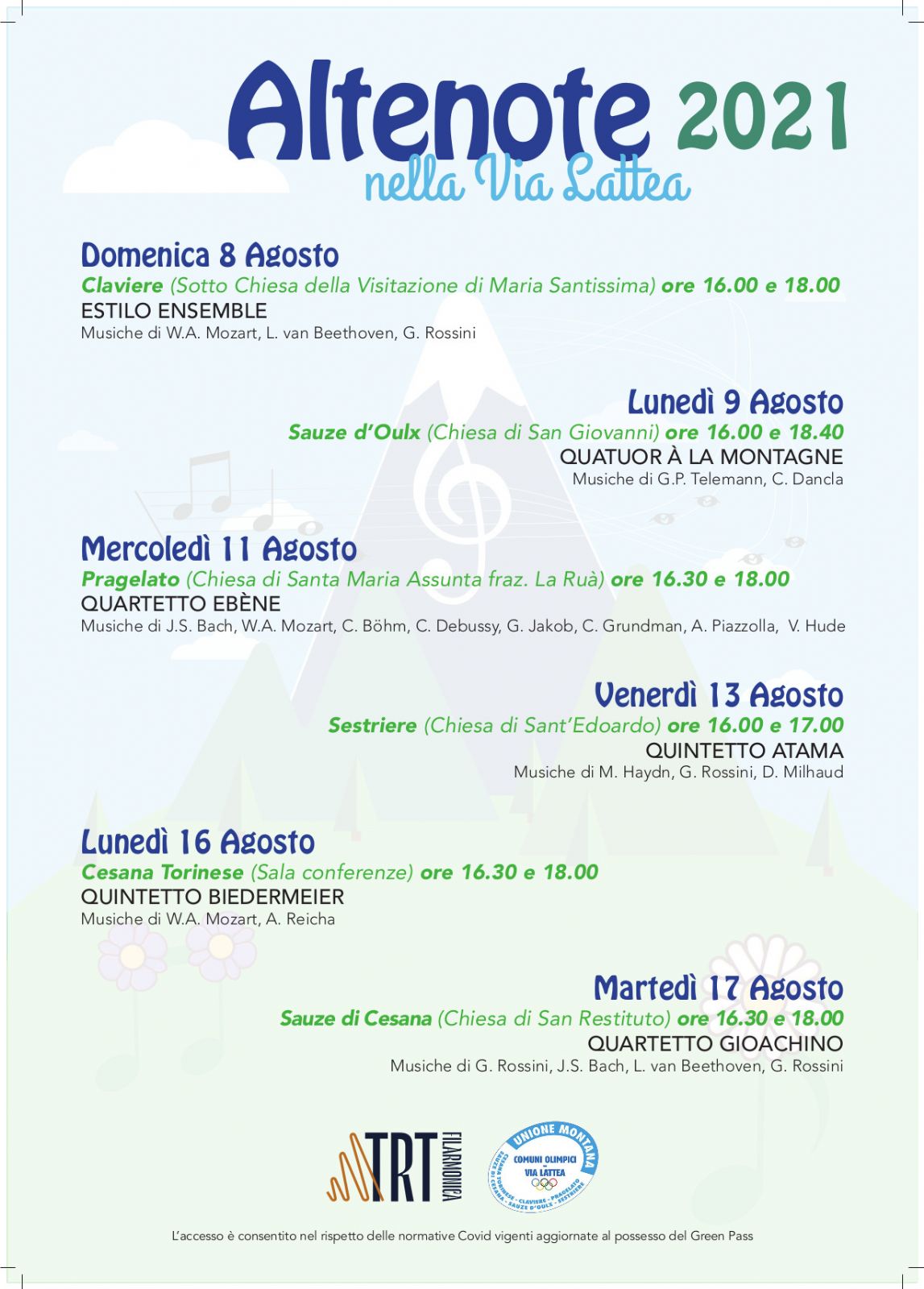Si informano i gentili ospiti che, in ottemperanza alle disposizioni nazionali, per assistere ai concerti gratuiti inseriti nel programma Altenote nella Via Lattea 2021 si dovrà necessariamente effettuare anzitempo la prenotazione personale presso gli uffici del turismo territoriali.
