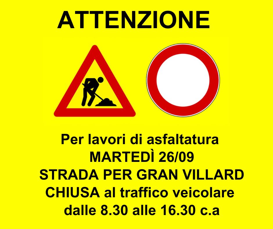 A fare seguito all'attività di riasfaltatura in oggetto si informa che per garantire la sicurezza della popolazione e degli operatori verrà chiusa la percorrenza al traffico veicolare il giorno martedi' 26/09 dalle ore 08,30 alle ore 16,30 circa. Sarà cura dell'impresa Borio informare l'utenza con apposita cartellonista