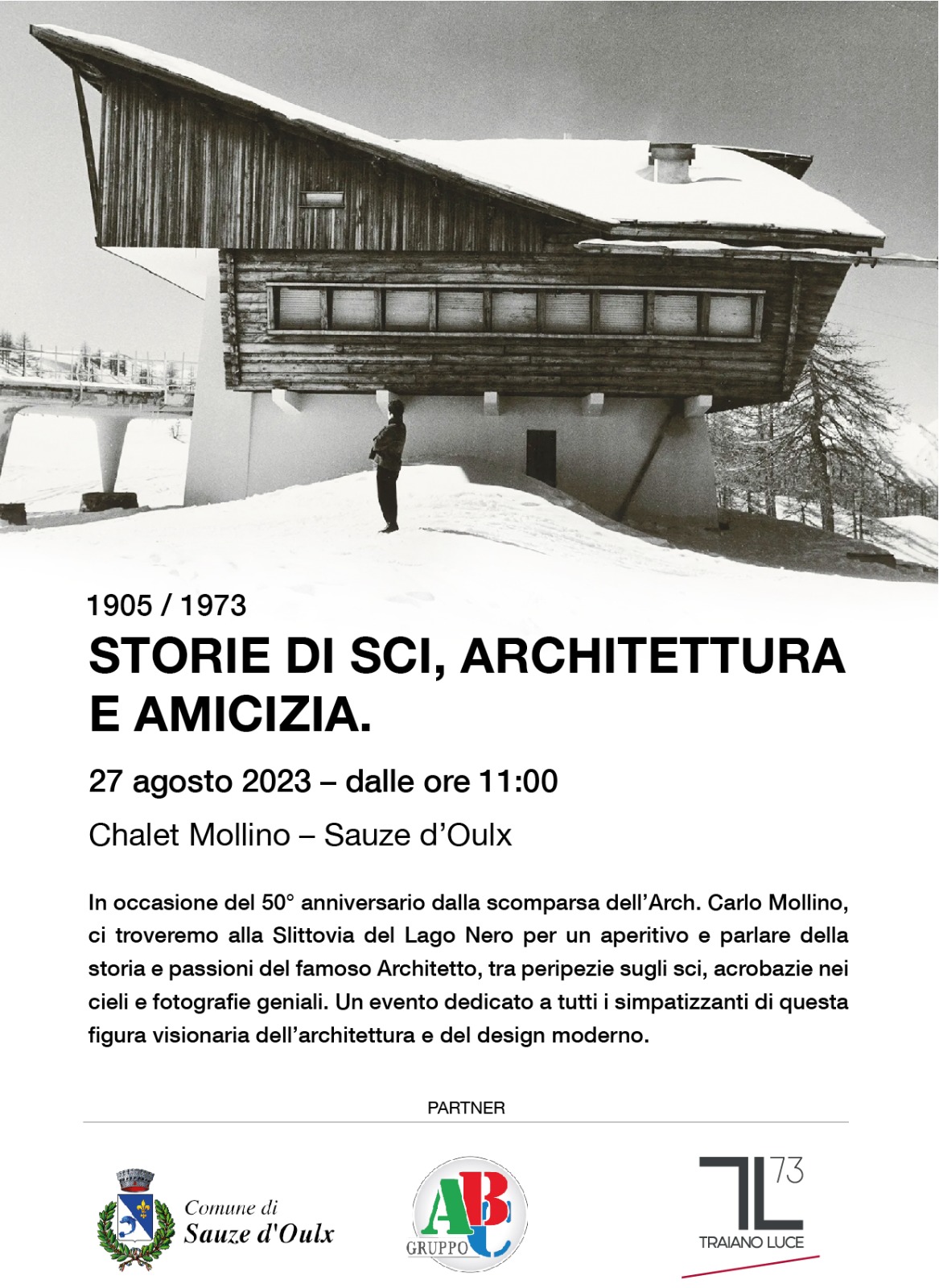 In occasione del 50° anniversario dalla scomparsa dell'Arch. Carlo Mollino, ci troveremo alla slittovia del Lago Nero per un aperitivo e parlare della storia e passioni del famoso Architetto, tra peripezie sugli sci, acrobazie nei cieli e fotografie geniali. Un evento dedicato a tutti i simpatizzanti di questa figura visionaria dell'architettura e del design moderno.