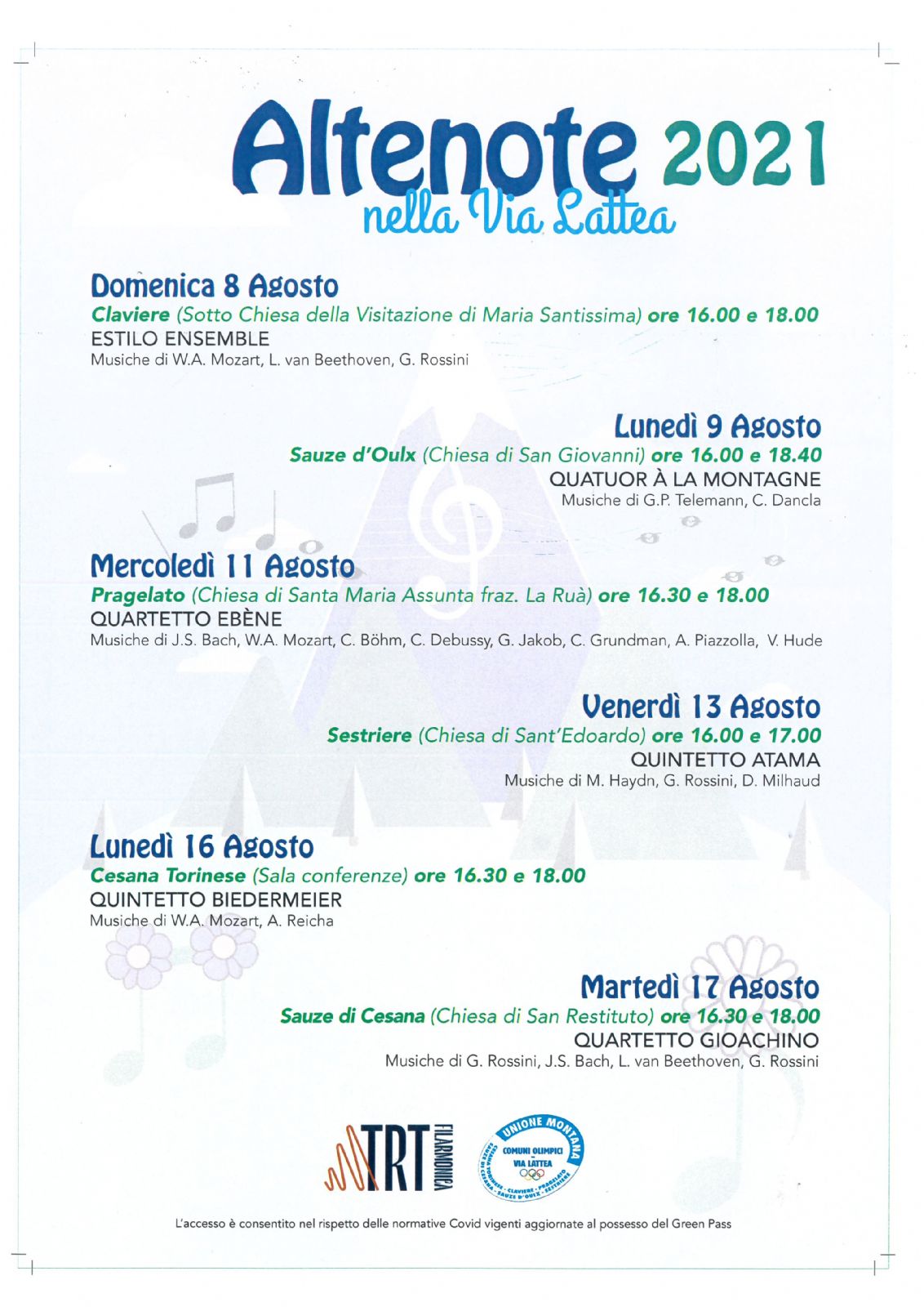 Per poter partecipare all’evento è necessaria la prenotazione presso l’Ufficio del Turismo di Sauze d’Oulx ed è obbligatorio esibire il GREEN PASS all'ingresso in chiesa.