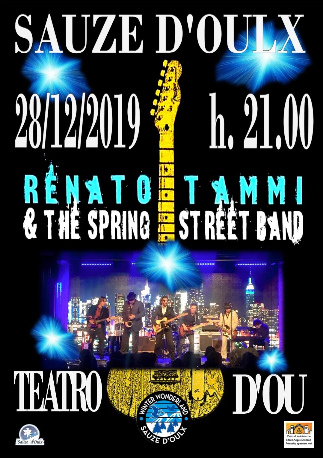 THE SPRINGSTREET BAND – Una TRIBUTE BAND di sette elementi nata nel 2009 ad alto impatto scenico e sonoro, una voce che ricorda lo Springsteen degli anni ’70 anche nell’aspetto fisico. Un tuffo negli album che hanno reso celebre il mito di Bruce Springsteen. Ore 21.00 Teatro d’Ou. Ingresso gratuito