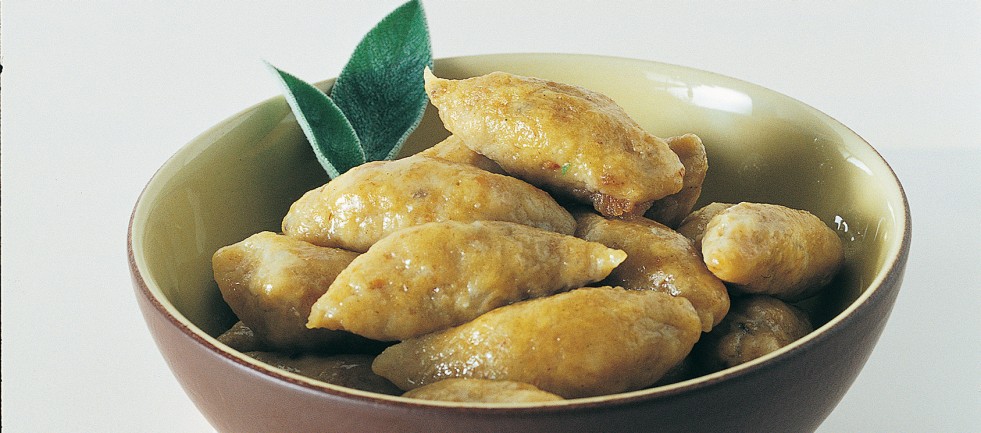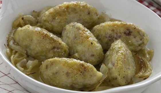 In una teglia di coccio imburrata mettere uno strato di gnocchi cospargerli di cipolla e burro fuso. Fare un secondo strato e cosi via fino al termine, l’ultimo strato sarà cosparso di pangrattato e noci.
