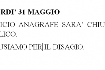 Leggi tuttoCHIUSURA UFFICIO ANAGRAFE 31 MAGGIO