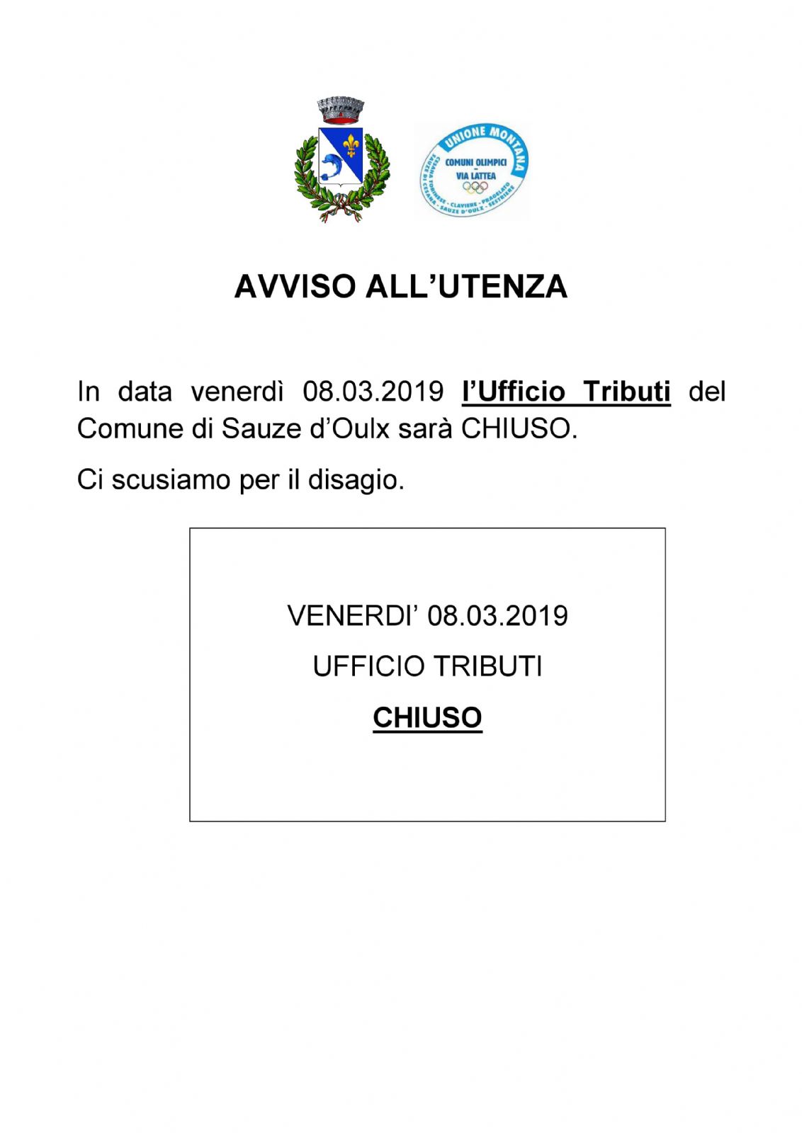 Si avvisa l'utenza che venerdì 08.03.2019 l'Ufficio Tributi resterà CHIUSO.