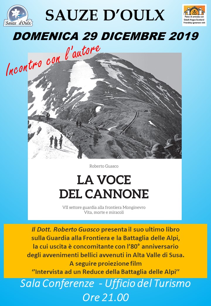 INCONTRO CON L’AUTORE - Il Dott. Roberto Guasco presenta: L'ARTIGLIERE DELLO CHABERTON la Storia del Forte più alto di Europa raccontata da chi ci ha lavorato, vissuto e combattuto. PARTE QUARTA DAL 1939 ALLA GUERRA DI LIBERAZIONE DAL NAZIFASCISMO – ORE 21.00 Sala Conferenze Ufficio del Turismo, V.le Genevris 7 - Ingresso gratuito