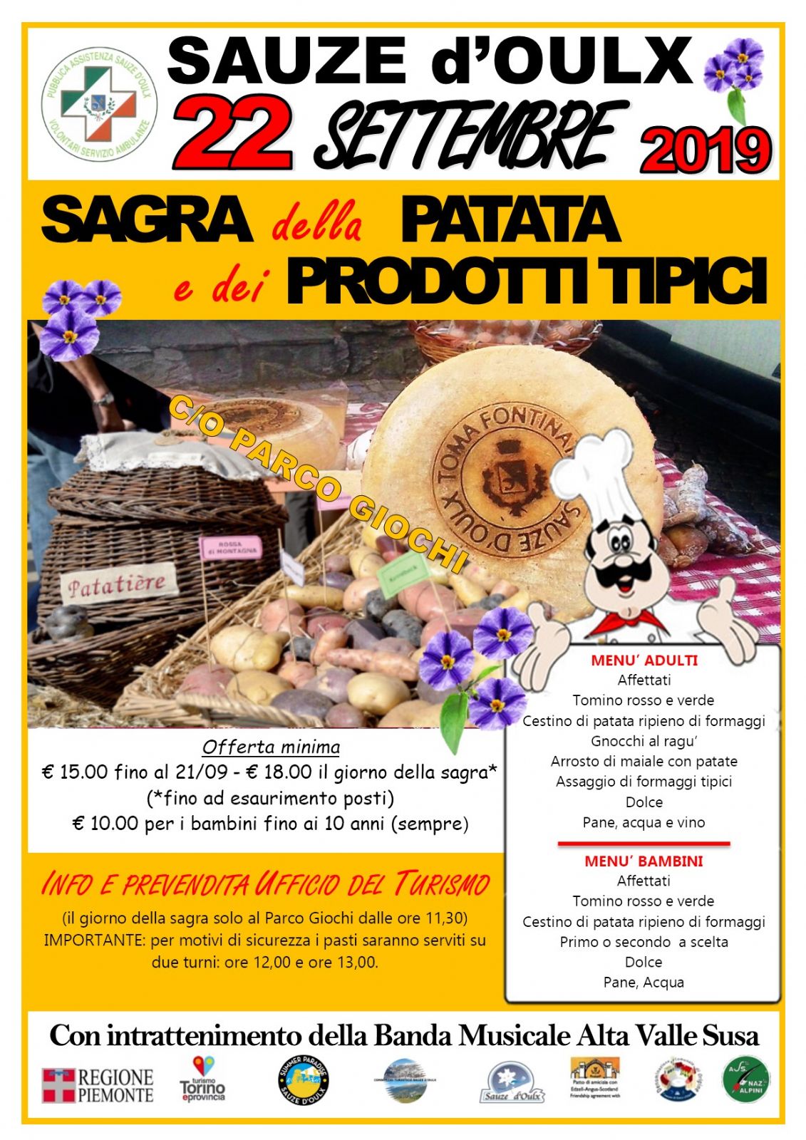 Ritorna, come ormai da tradizione ventennale la Sagra della Patata di Montagna e dei Prodotti Tipici di Sauze d’Oulx. Il programma della giornata è molto semplice, ma intenso. Sin dal mattino nell’area del Parco Giochi Comunale saranno esposte le patate e le altre specialità di mercato e la fiera entrerà quindi subito nel vivo. Per poter degustare le patate di montagna in tutte le sue declinazioni bisognerà però aspettare l’ora di pranzo. Infatti si potrà mangiare presso la struttura coperta al Parco Giochi Comunale a partire dalle 12,00. Il menù è ovviamente a base di patate di montagna. Prevendita biglietti per il pranzo presso Ufficio del Turismo fino al giorno prima alle ore 12.00. Per informazioni Ufficio del Turismo di Sauze d'Oulx -Tel. 0122 858009 Una particolarità: le patate di montagna di Sauze d’Oulx si possono vantare tutte di un marchio comunale, la De.Co, ovvero denominazione comunale, che prevede un disciplinare di produzione e che è nata con lo scopo di valorizzare la produzione tipi