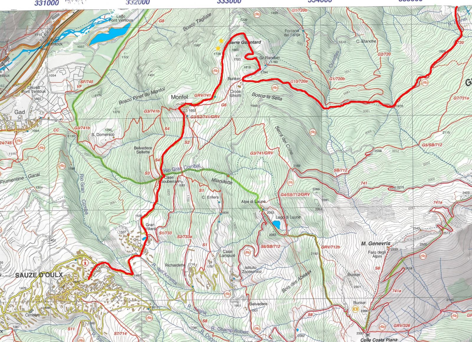 Partendo dal centro di Sauze d’Oulx si prende Via Monfol in direzione Gran Villar. Si prosegue lungo la strada asfaltata che conduce all’abitato di Monfol (3,12 km) da dove inizia la strada sterrata per l'area attrezzata Serre Blanche (3.78 km). Passata la sbarra, che segna l’ingresso del Parco Naturale del Gran Bosco di Salbertrand, continuiamo a destra su un primo pezzo di strada pianeggiante. Tralasciamo sulla sinistra il bivio che porta verso l'Alpeggio Randuin e proseguiamo a destra. Dopo alcuni brevi tratti più impegnativi si arriva ad un altro bivio. Qui si va a sinistra e si segue una strada boschiva piuttosto rettilinea a semi pianeggiante fino a raggiungere la discesa che ci conduce alla Borgata Seu (9,6 km) e al Rifugio D. Arlaud. Ritorno lungo la strada dell'andata.