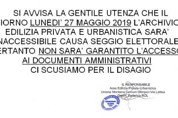 ACCESSO AGLI ATTI LIMITATO PER IL GIORNO LUNEDI' 27/05/2019