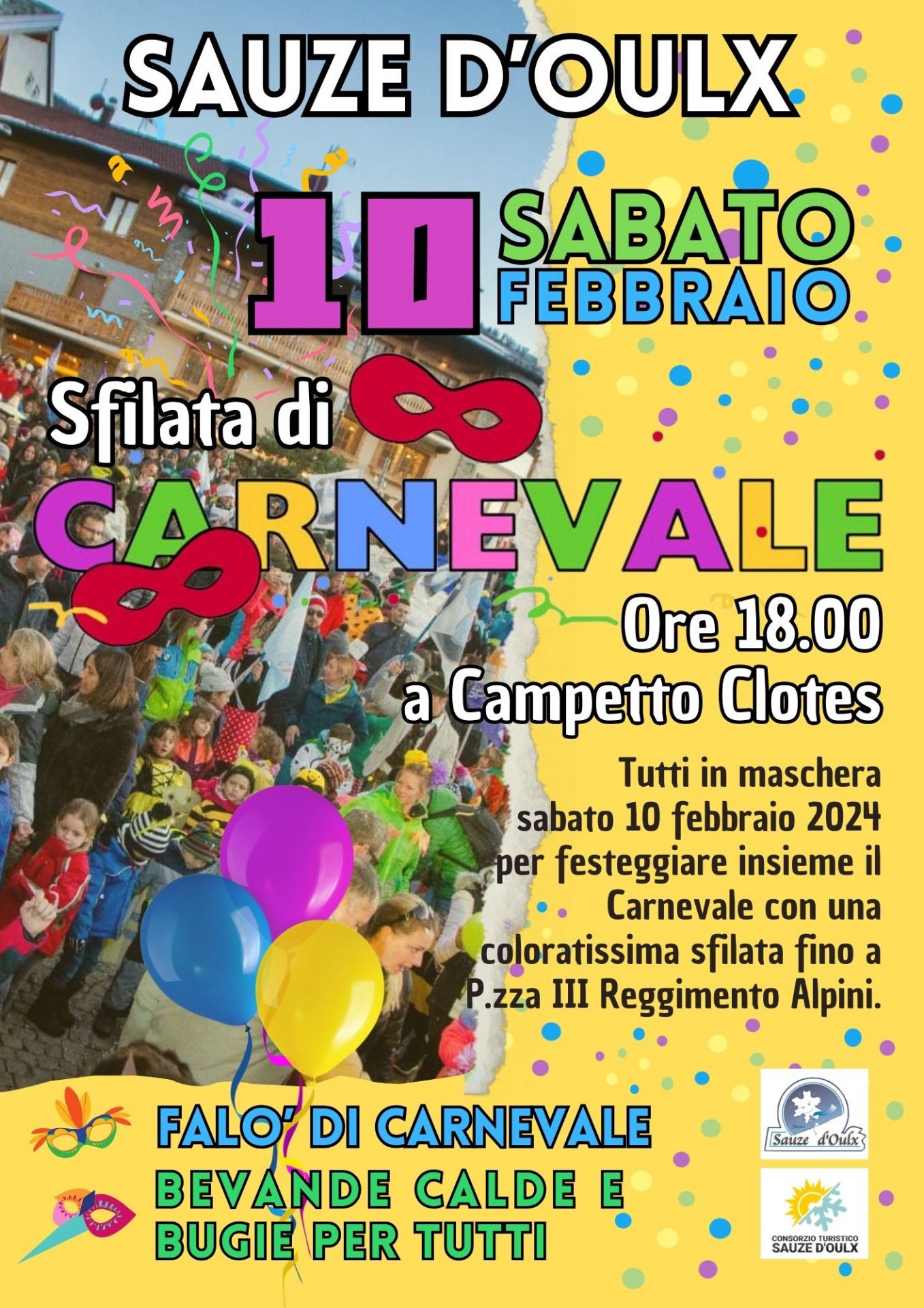 Sfilata in maschera organizzata dal Consorzio Turistico Fortur da Campetto Clotes a Piazza III Reggimento Alpini. Falo' di Carnevale, bevande calde e bugie ad accogliervi.