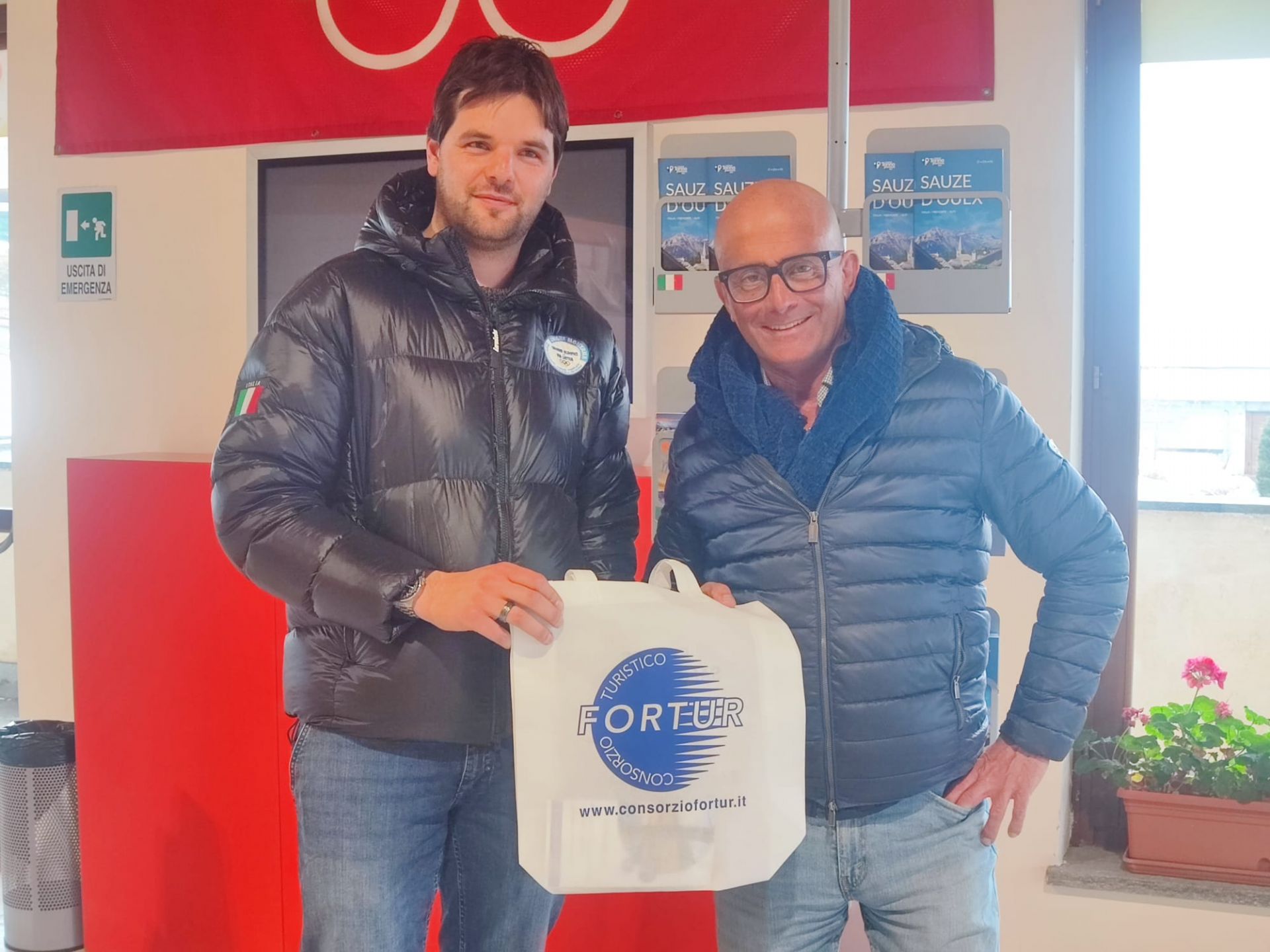 Per ringraziare Alberto Falcombello anche alcuni gadget del Consorzio Turistico Fortur con la presidente Serenella Marcuzzo che ringrazia: “Ringraziamo Alberto Falcombello per queste sue 100 sciate a Sauze d’Oulx e per il suo attaccamento al nostro paese”.