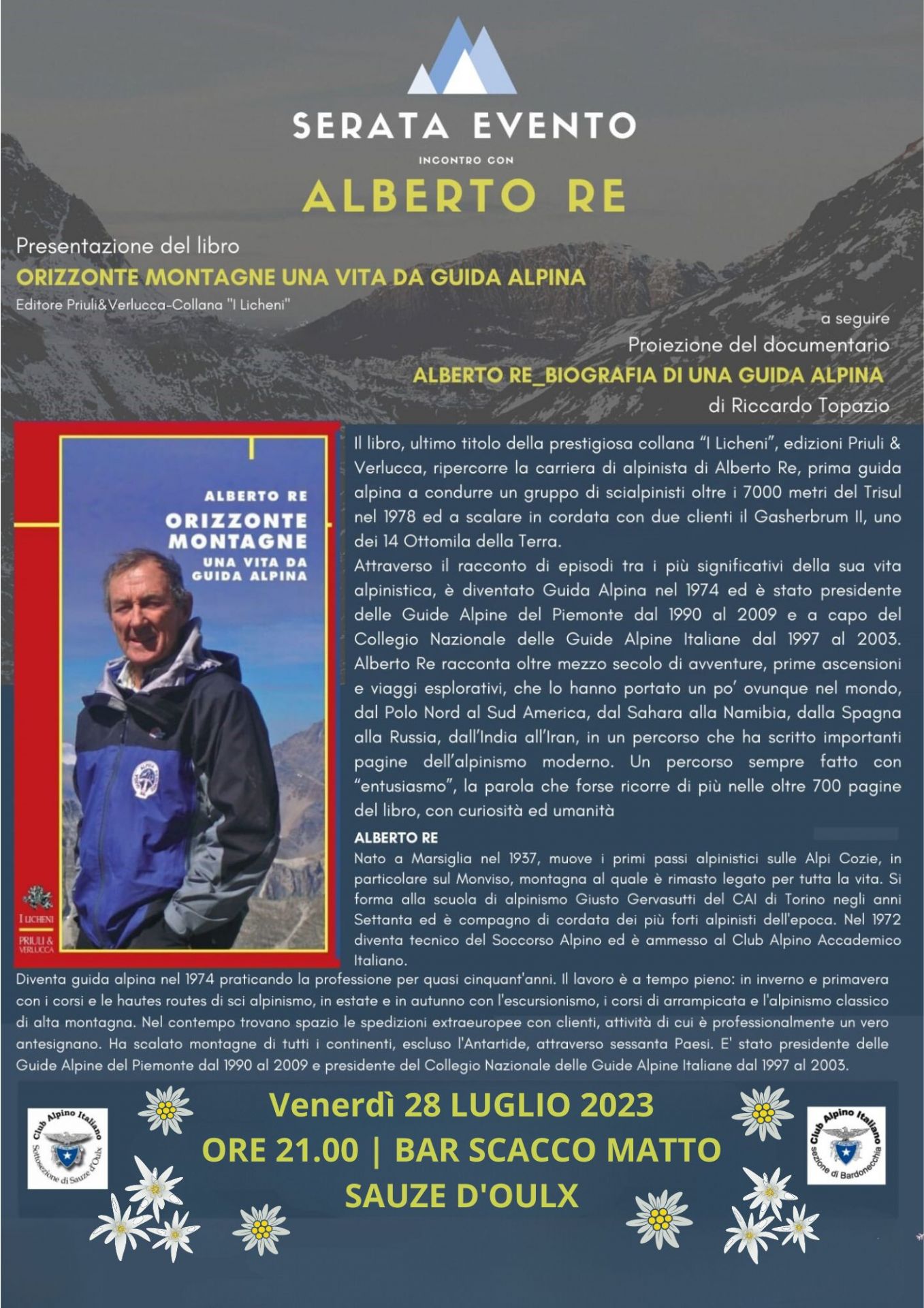 I VENERDI’ DEL CAI – serate informative e culturali organizzate della sottosezione CAI di Sauze d’Oulx. La guida alpina Alberto RE presenta: “Orizzonte montagne. Una vita da guida alpina”. Attraverso il racconto di episodi tra i più significativi della sua vita alpinistica, Alberto Re racconta mezzo secolo e più di avventure, prime ascensioni e viaggi esplorativi che lo hanno portato un po' ovunque nel mondo, dal Polo Nord al Sud America, dal Sahara alla Namibia, dalla Spagna alla Russia, dall'India all'Iran, in una rete di connessioni che tocca quasi tutto il globo.