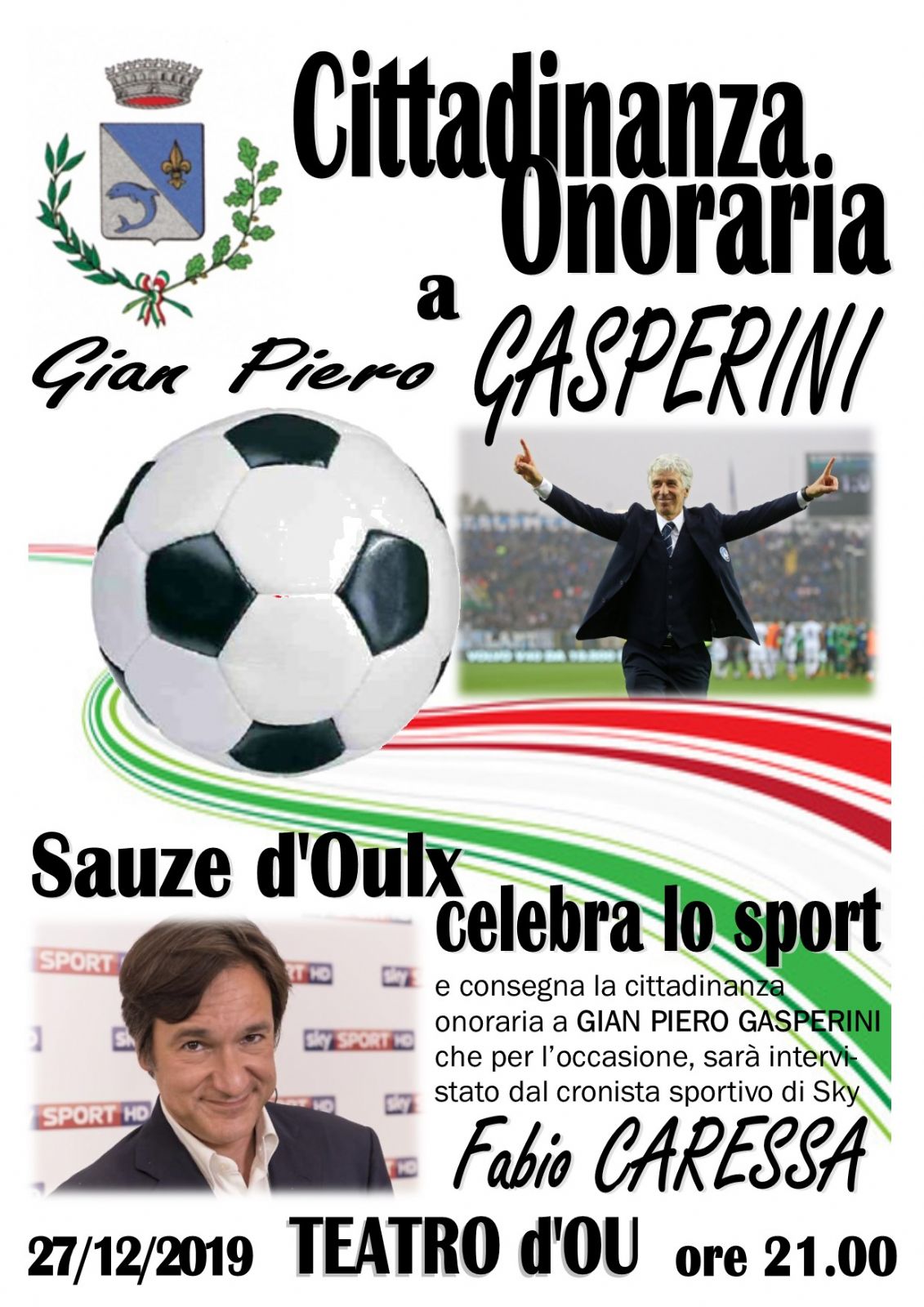 SAUZE D’OULX CELEBRA LO SPORT e consegna la cittadinanza onoraria a GIAMPIERO GASPERINI mister del Atalanta che, per l’occasione, sarà intervistato dal celeberrimo cronista sportivo di Sky FABIO CARESSA. Una serata da non perdere al Teatro d’Ou di Sauze d’Oulx alle ore 21.00. Ingresso gratuito