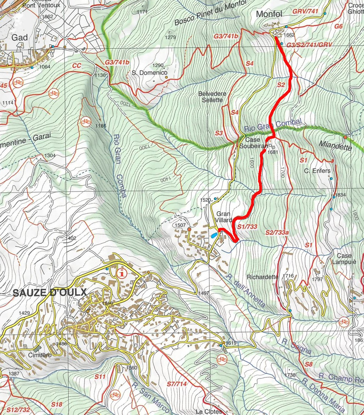 Partendo dal centro paese seguire via Monfol in direzione Gran Villard. All'altezza del Laghetto imboccare la carrareccia che parte sulla destra. Dopo 20 minuti circa, all'incrocio, ignorare la strada a destra e proseguire sulla sinistra. Dopo 10 minuti circa si arriva a case Soubeiran. Qui il sentiero da imboccare è quello a sinistra numerato come "2". All'ncrocio che si inconatra dopo circa 10/15 minuti di cammino voltare a sinistra verso l'abitato di Monfol. Rientro per lo stesso sentiero oppure lungo la strada asfaltata che ritorana a Sauze d'Oulx.