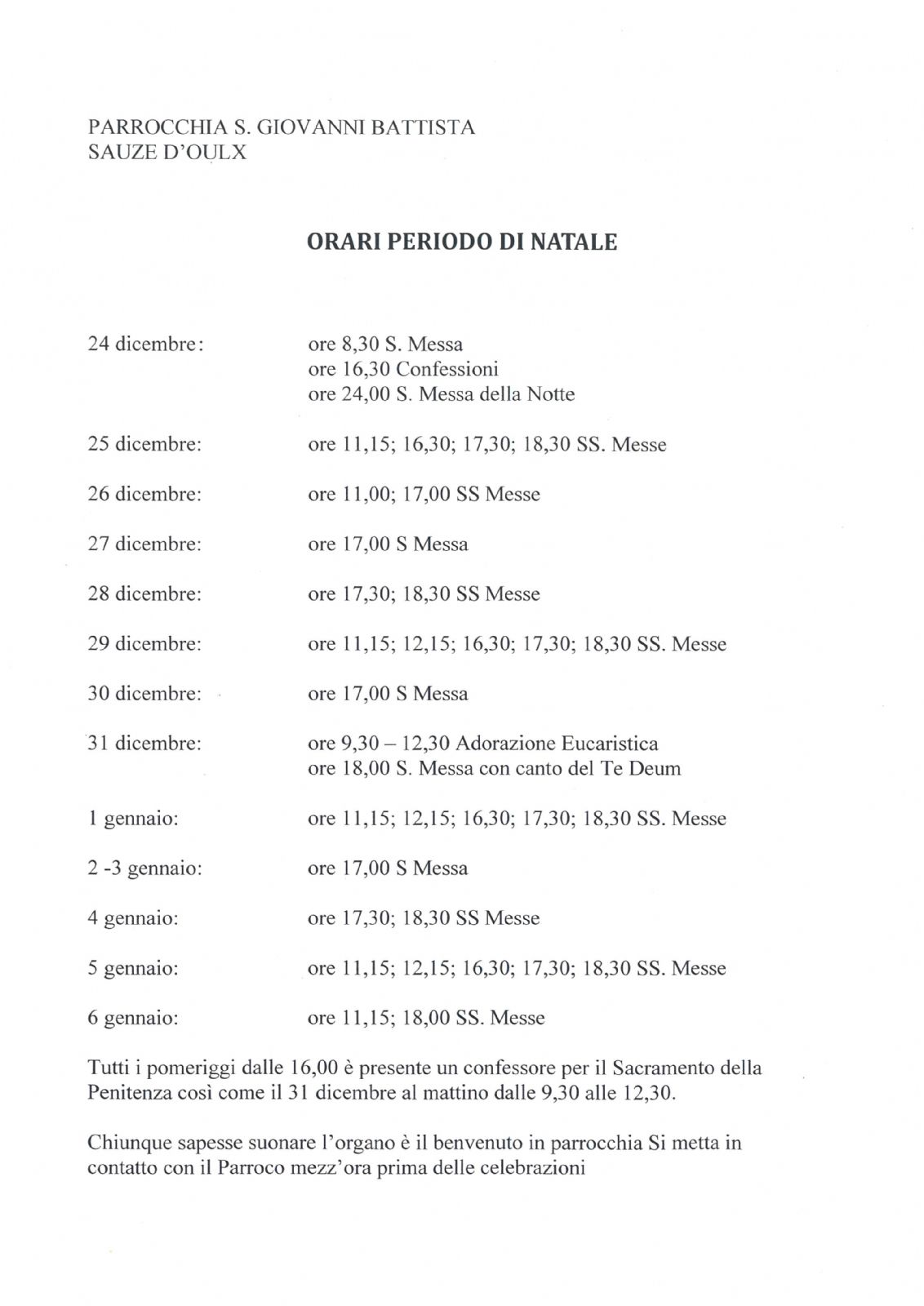 ORARIO SANTE MESSE PERIODO DI NATALE