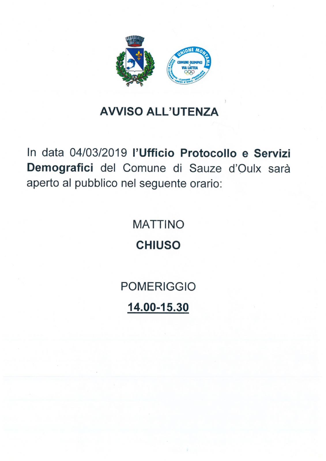 Si comunica all'utenza che in data lunedì 04.03.2019 l'ufficio protocollo e servizi demoagrafici osserverà il seguente orario: