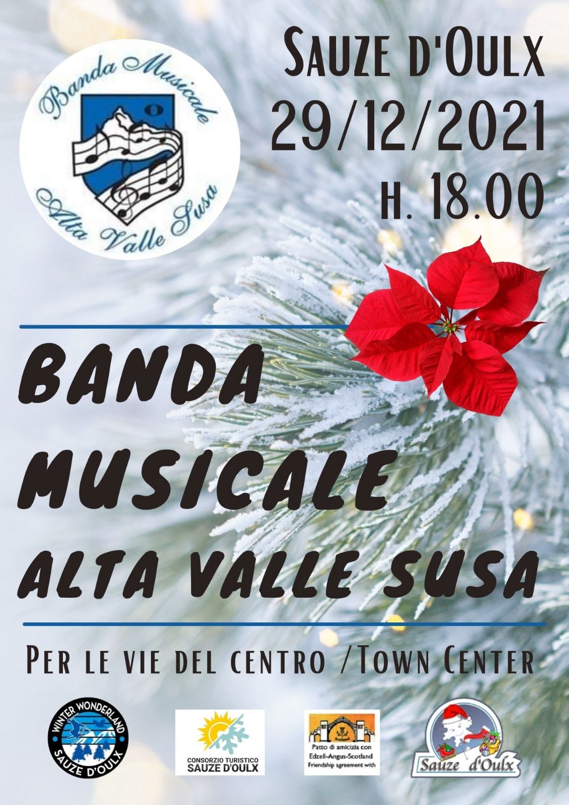 29/12/2021 - BANDA MUSICALE ALTA VALLE SUSA – Torna l’immancabile appuntamento con la piacevole musica della Banda Alta Valle Susa. Con un repertorio sorprendente di brani che spaziano tra tradizione e modernità la “Banda” garantisce un momento di simpatia e buona musica.