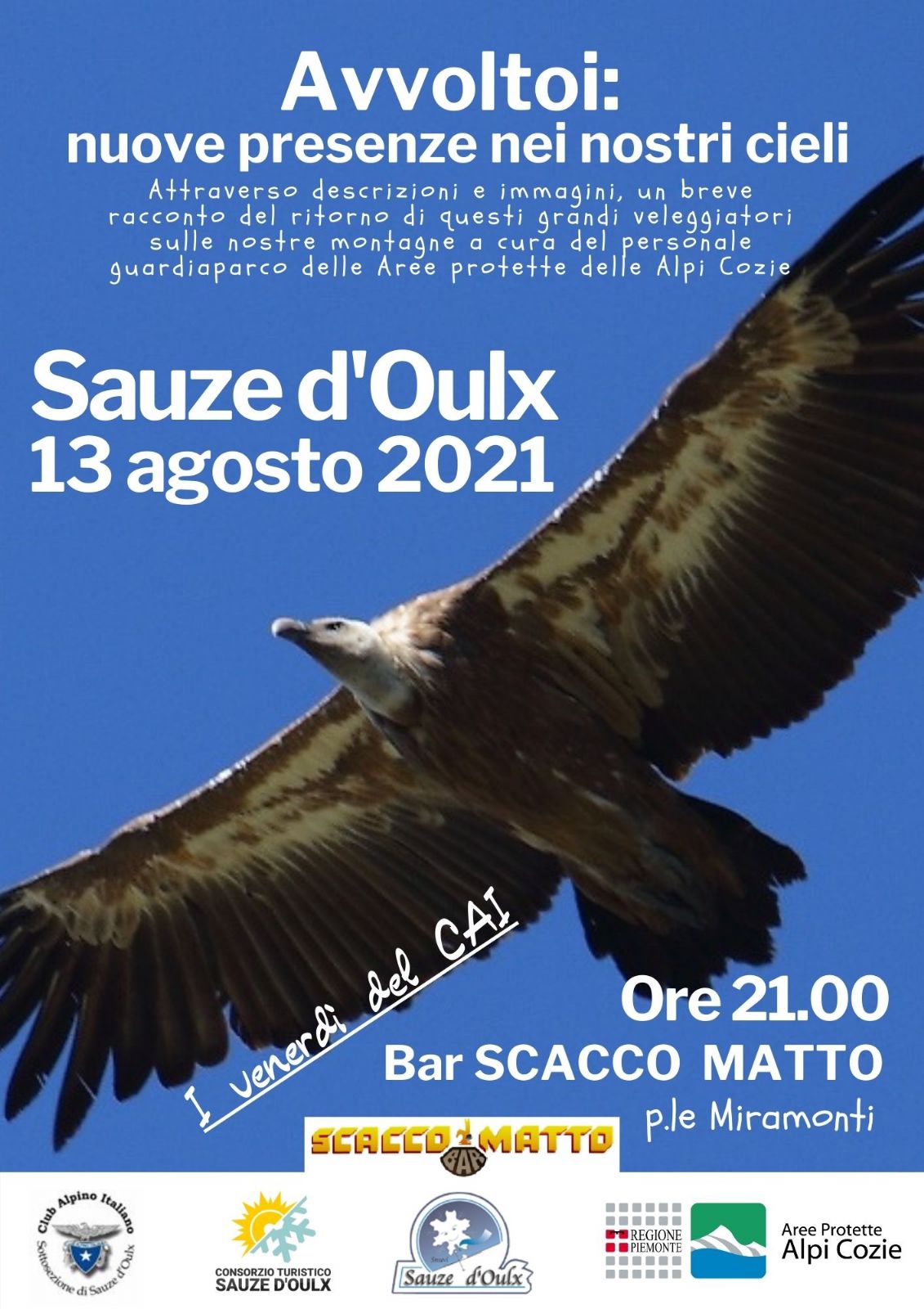 Serate informative e culturali organizzate dalla sottosezione CAI di Sauze d’Oulx. AVVOLTOI: NUOVE PRESENZE NEI NOSTRI CIELI. Attraverso descrizioni e immagini, un breve racconto del ritorno di questi grandi veleggiatori sulle nostre montagne a cura del personale guardiaparco delle Aree protette delle Alpi Cozie. Ore 21.00 c/o Bar Scacco Matto, p.le Miramonti