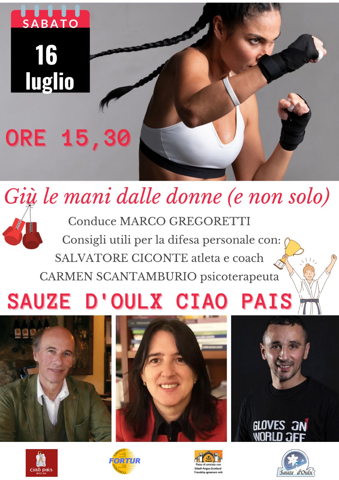 MISTERI IN QUOTA - L’incredibile cornice naturale della località Ciao Pais come teatro della rassegna di “misteri in quota” a cura del giornalista di inchiesta ed investigativo Marco Gregoretti. GIU' LE MANI DALLE DONNE (e non solo). Cenni e consigli utili per la difesa personale. Con Salvatore Ciconte, atleta e coach e Carmen Scantamburlo, psicologa. Conduce Marco Gregoretti. Ore 15.30 - Località Ciao Pais