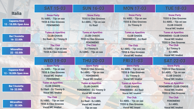 Si parte con il relax alla Capanna Kind dalle 12 alle 14,30 dove si pranza con deliziose melodie in sottofondo e poi, fino alle 18, tutti a ballare con gli scarponi da sci ai piedi per l'ormai famosissimo "snowparty". Il tutto ad accesso libero. Dalle 16 alle 22 si prosegue e ci si scatena al Bar Hotel Assietta con le hit internazionali dei dj con sax e/o MC con ingresso con braccialetto. La giornata si chiude al Miravallino dove si balla dalle 22 alle 02 durante il Club Music internazionale di vari DJ e MC, con ingresso con braccialetto.