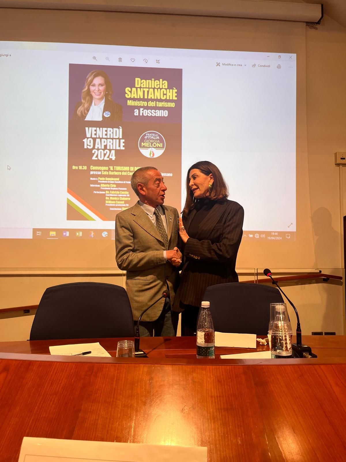 Al convegno con il Ministro Santanchè ed il Consigliere Regionale Bongioanni, sono interventi altresì il sindaco di Fossano Dario Tallone, il candidato Fdi alle prossime elezioni europee Giovanni Crosetto, il presidente di Atl del Cuneese Mauro Bernardi il presidente di Visit Piemonte Beppe Carlevaris, il coordinatore provinciale di Fdi William Casoni e il senatore della Lega Giorgio Maria Bergesio.