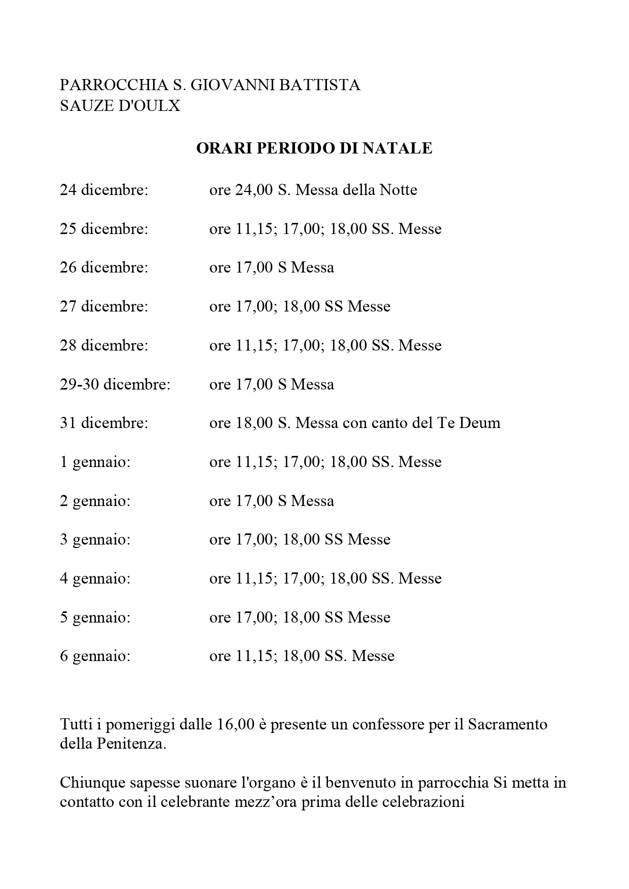 1 gennaio: ore 11,15; 17,00; 18,00 SS. Messe