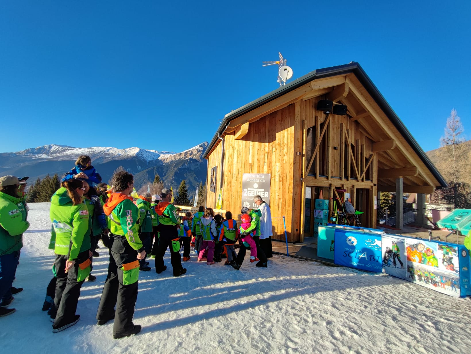 Sono stati i bimbi della scuola di sci a lanciare le loro palle di neve sul cartello che capeggia sul nuovissimo chalet, la nuova confortevole casa del Progetto SciAbile Onlus.