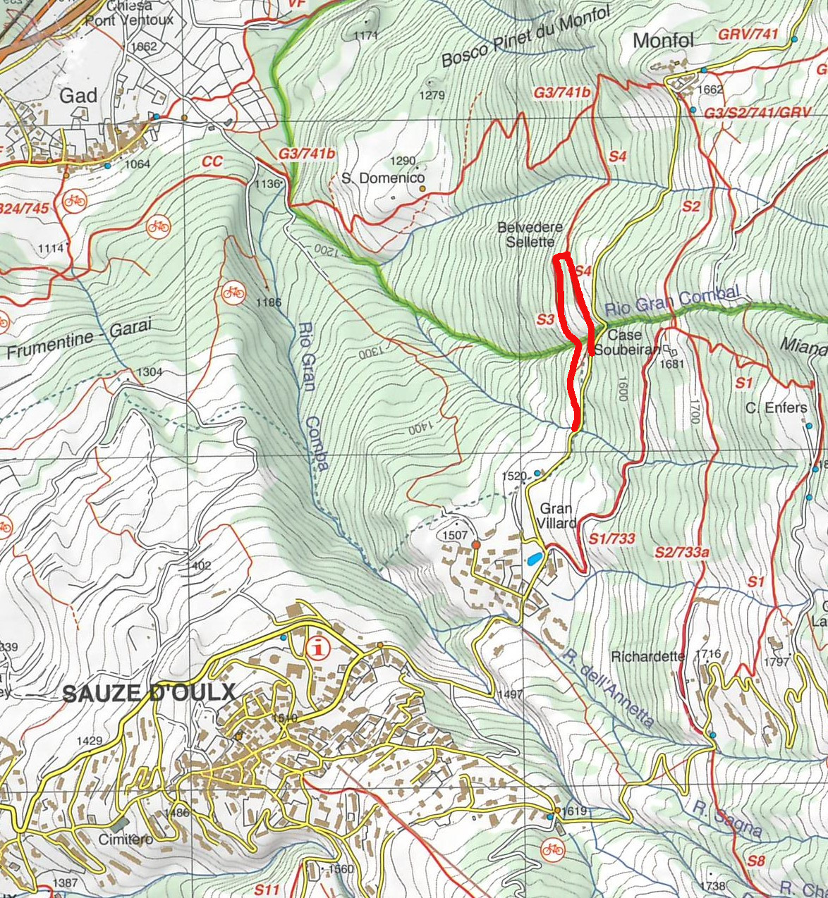 Partendo dal centro paese seguire via Monfol in direzione Gran Villard. Passato il Laghetto continuare lungo la strada asfaltata che porta a Monfol e, all'inizio della salita, imboccare il sentiero che si trova alla vostra sinistra. Proseguire fino al belvedere e poi girare a destra; salire i pochi scalini scavati nel terreno e rientrare per il sentiero che trovate alla vostra destra. Una volta raggiunta la strada asfaltata girare a destra in discesa.